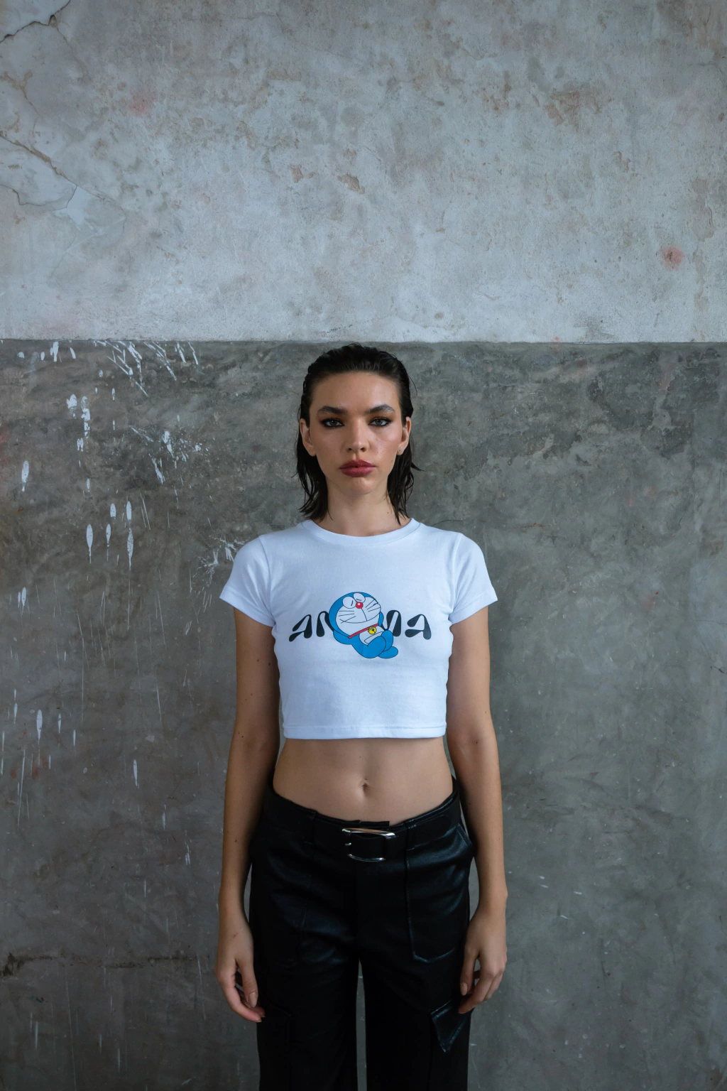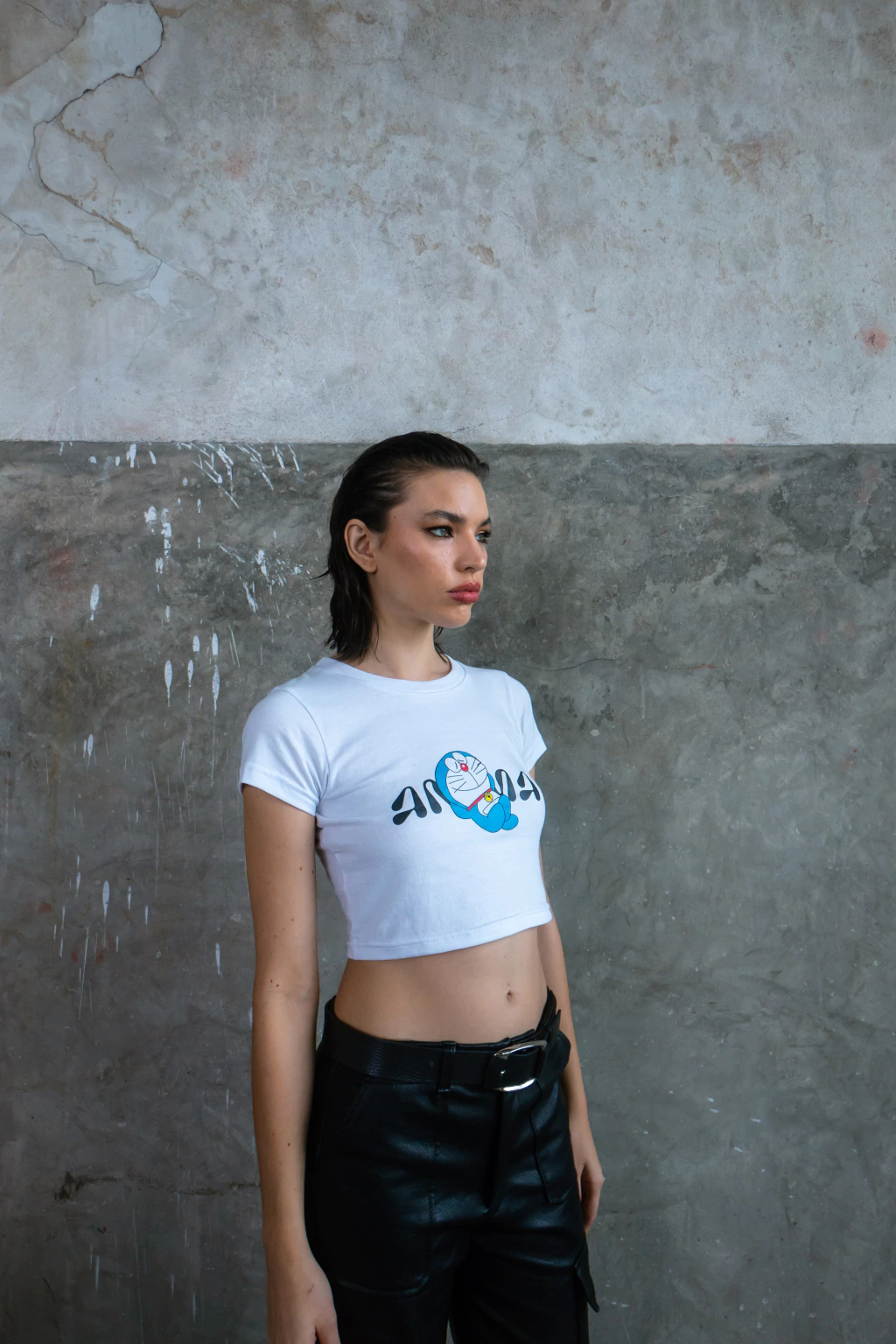Baby tee color blanco con corte entallado. Confeccionada en algodón peinado. Estampa delantera realizada a través de serografía centrada.
