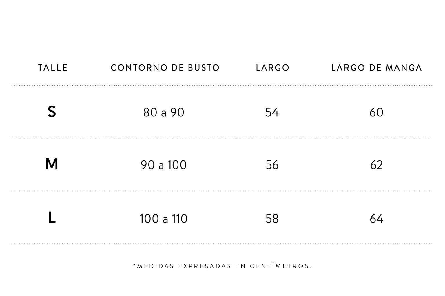 Todas las medidas estan tomadas en centímetros. Para medirte recomendamos usar un centímetro