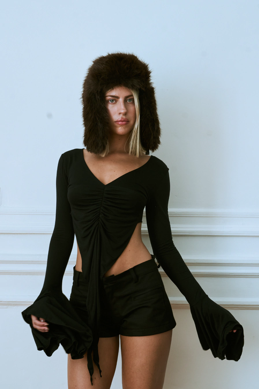 Top confeccionado en rayón. Inspirado en los años 70. Mangas mega protagonistas. Frunce en el medio del busto. Espalda semi descubierta.